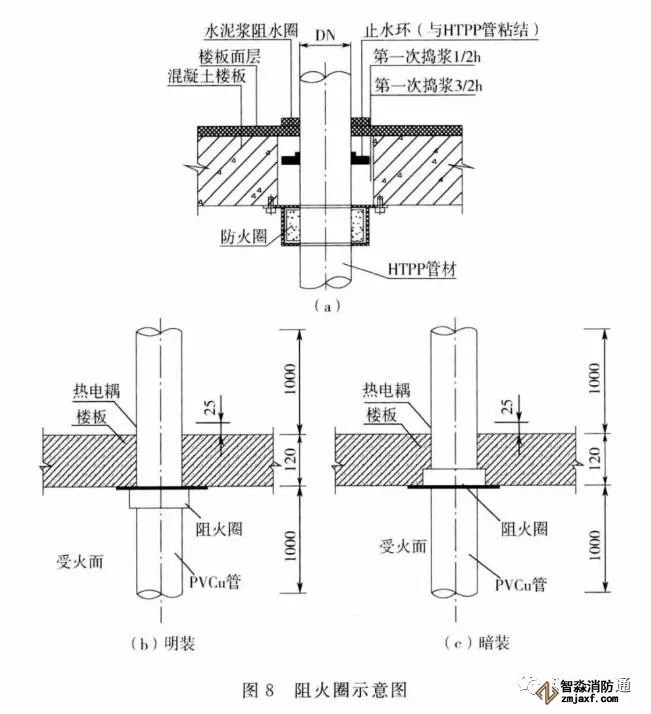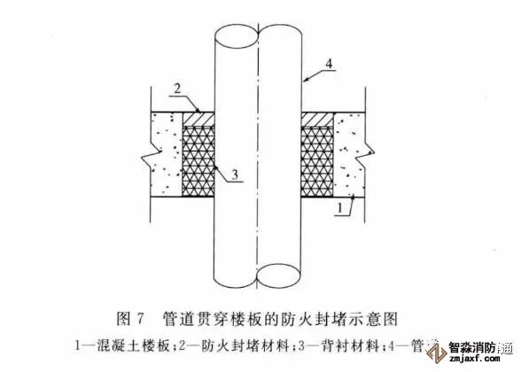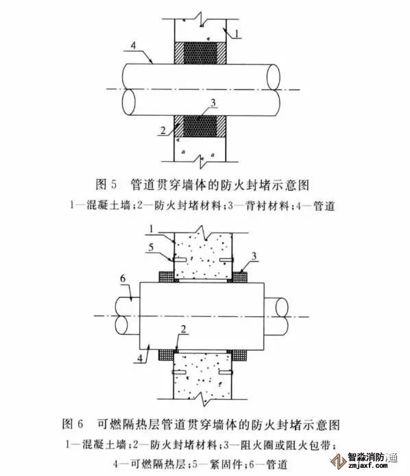 3.0.11 阻火圈或阻火包帶安裝時,是將阻火圈或阻火包帶套在或纏繞在硬聚氯乙烯等塑料管道外壁上。火災時,阻火圈或阻火包帶的阻燃膨脹芯材受熱迅速膨脹后擠壓管道,使貫穿孔口被封堵,起到阻止火勢和煙氣沿燒蝕的管道蔓延的作用。阻火圈或阻火包帶有明裝和暗裝兩種安裝方式,但水平貫穿墻體等的孔口的封堵應在墻的兩側都設置阻火圈或阻火包帶,豎向貫穿樓板等的孔口的封堵,則宜在樓板下側設置阻火圈或阻火包帶。