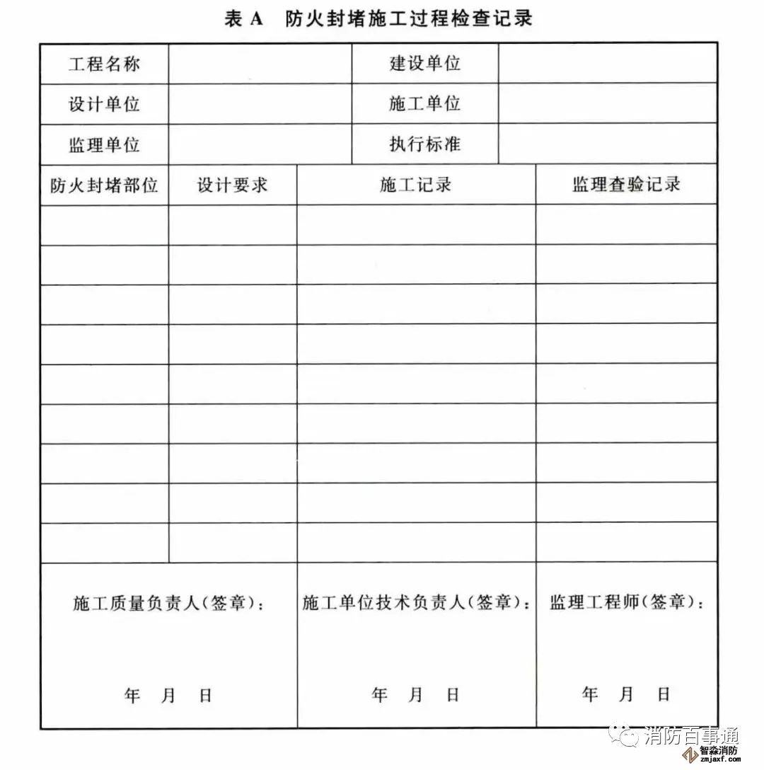 6.1.5 建筑防火封堵的竣工驗收,要按程序進行。一般情況下,可根據需要由建設單位會同設計、監理、施工和防火封堵材料制造或供應商等單位以及施工質量監督部門共同進行,在竣工驗收報告上填寫驗收意見并簽名和蓋章。
