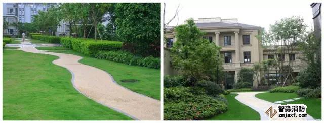 4 中心軟化:在消防車道的中心軸線種植低矮植物或草皮,既不會影響消防車輪的行駛,又美化、軟化了消防車道。可選擇種植小型花灌木等矮地被植物,這類灌木長不高,且常年開花,關鍵是其不會影響消防車的通行。
