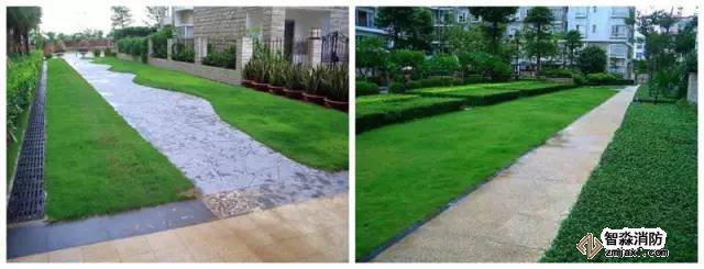 2 曲線化:將消防車道設計成曲折的步行小徑,采用種植草磚在小徑之外種植草皮,縮窄路面寬度,達到軟化、美化、綠化消防通道的目的。但由于草皮植土較淺,后期需要花費較多的養護費用。