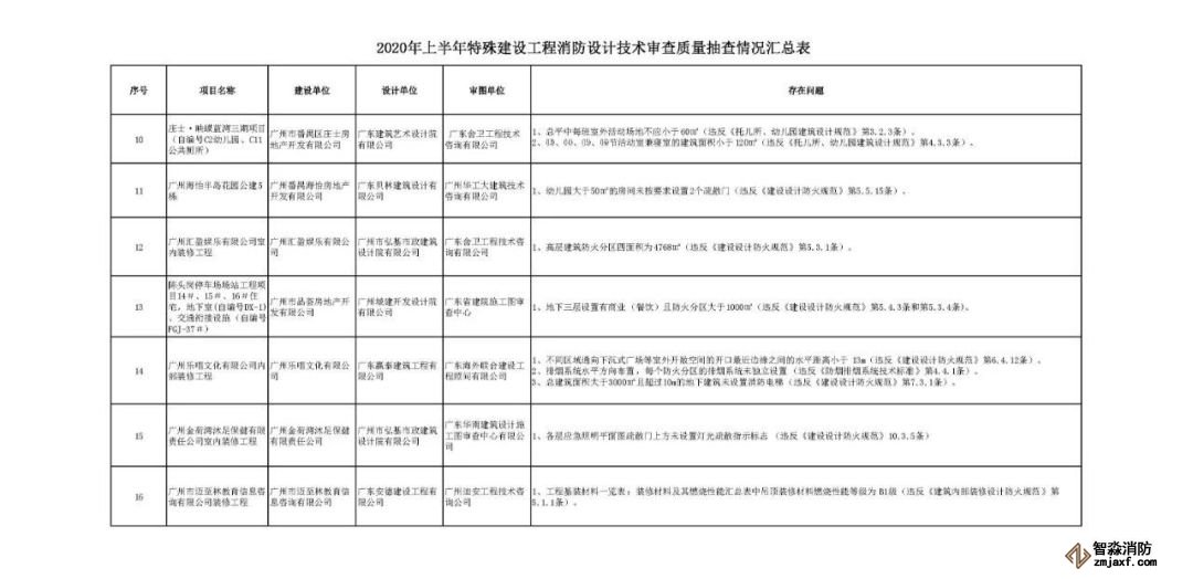 我局于6月30日邀請地方專家在2020年上半年向我局申報的55個建設工程消防設計審查項目中,抽取其中的16個項目,對消防設計審查質量進行了檢查。發現設計圖紙仍存在較多違反消防技術規范標準的問題,反映了部分項目的設計單位未嚴格按照現行消防技術規范標準進行設計,施工圖審查機構審查不嚴,未嚴格落實國家消防法規、技術規范標準,尤其是對強制性條文的理解、執行仍不到位,責任心有待增強、消防設計質量有待進一步提高。