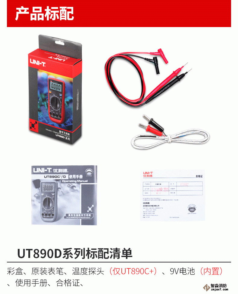 | 標準配件 | 表筆、電池、溫度探頭 (僅UT890C+) | ||