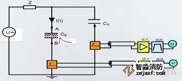 在電纜的中間接頭,測試原理如圖所示,一側電纜的鎧裝與電纜導體之間存在電容Ca,另一側電纜的導體與鎧裝之間存在電容Cb,如果在電纜的中間接頭發生局部放電,那么形成兩個電容C1和C2,此時Ca和Cb就會通過導體向C1和C2充放電,從而形成局放電流回路,在兩側電纜屏蔽層橋接一個高頻低阻的電容臂C0和高頻電流傳感器,就可以檢測到局放的脈沖電流信號。
